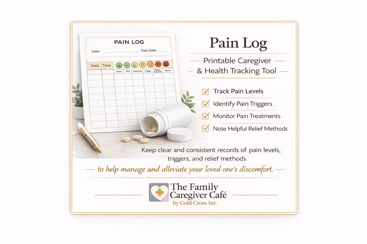 A simple printable pain log designed to support clear communication during caregiving and medical appointments. Includes a visual pain scale with faces and numbers, an instruction page, and repeatable tracking sheets. Helpful for caregivers, families, children, and individuals with communication challenges. Not a substitute for medical advice.