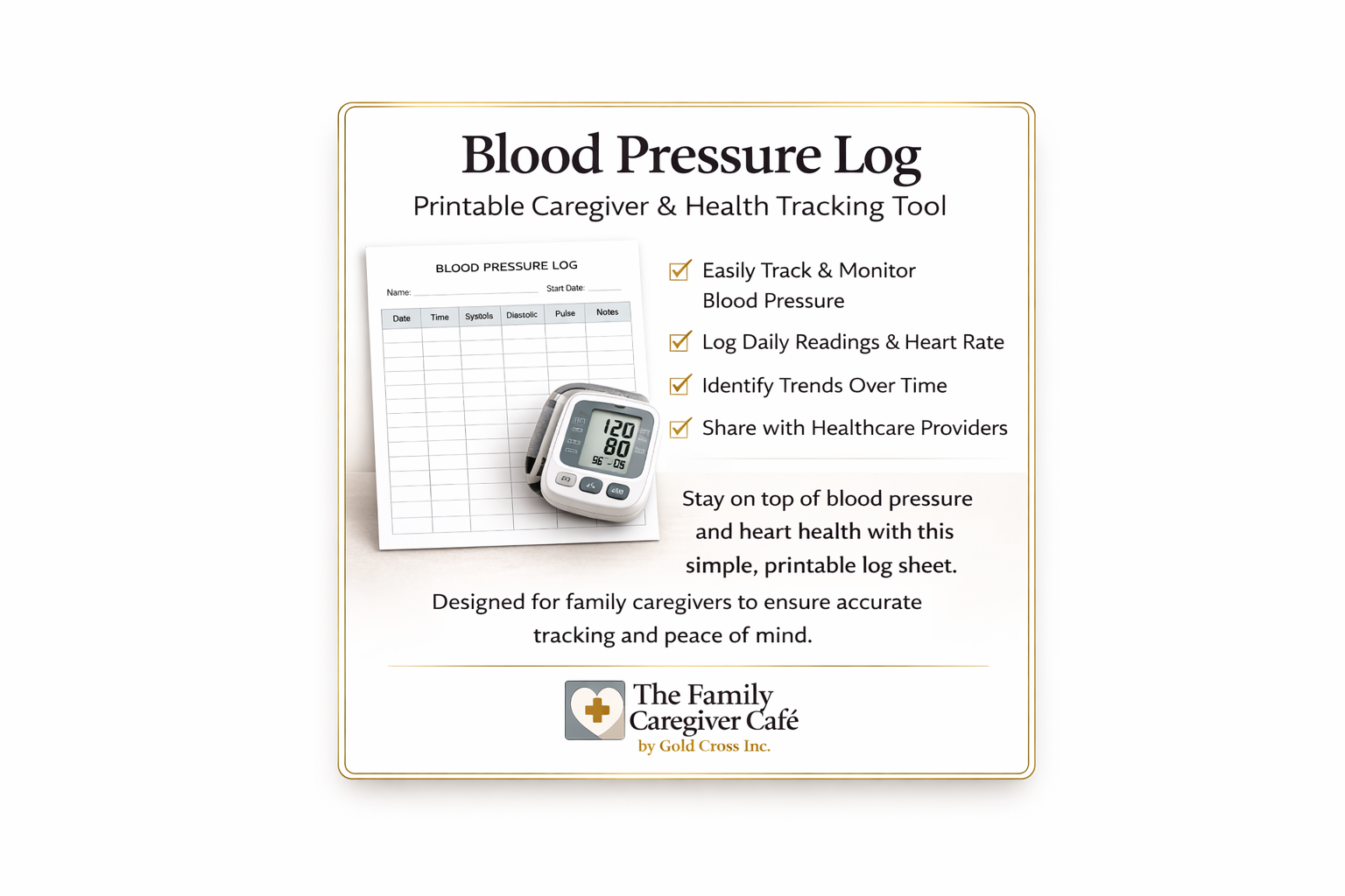 A simple, printable blood pressure log designed for clear, consistent tracking at home or for medical appointments. Ideal for individuals and family caregivers, this easy-to-use tool helps record readings, monitor trends, and stay organized when managing health or supporting a loved one. Instant digital download.